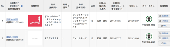 図形商標にも「FITKEEP」の文字が入っていますが、文字「FITKEEP」とは非類似とされる恐れがあるまめ、模倣被害を認識した後、文字商標を新たに出願したと思われます。