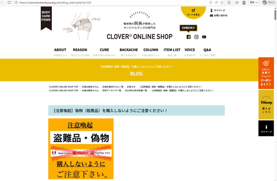 商標「FITKEEP」の権利者は、模倣品対策に苦労していたようで、図3に示すように、Webサイトにおいて注意を促しています。